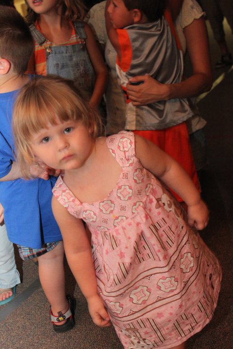 For the second dress, I pretty much followed the pattern but made the straight straps instead of the gathered straps. .This dress was a lot easier since I didn’t have to match patterns but I like the first one better. It’s really hard to see the dress in the picture. She was very excited and I couldn’t get her to stand still. Her hair also wasn’t brushed yet so it’s all over the place. The first picture was taken at VBS. I think she’s dancing!